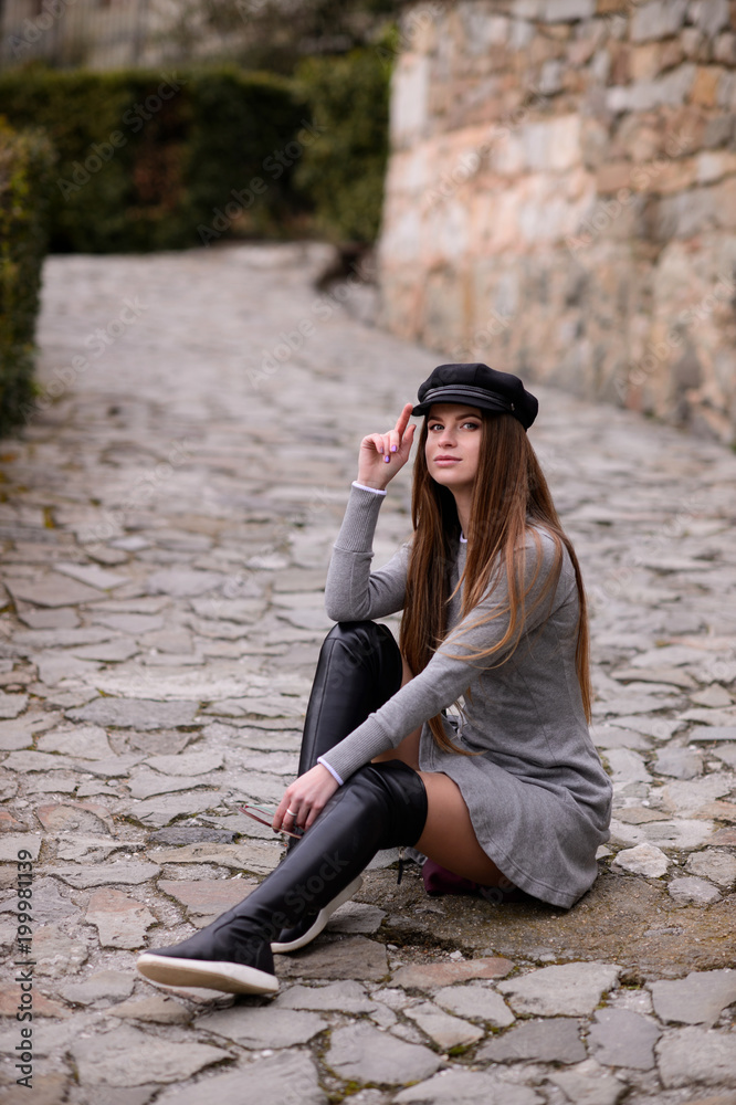 A beautiful girl in a cap is walking around the college. A student is enjoying a spring day.
