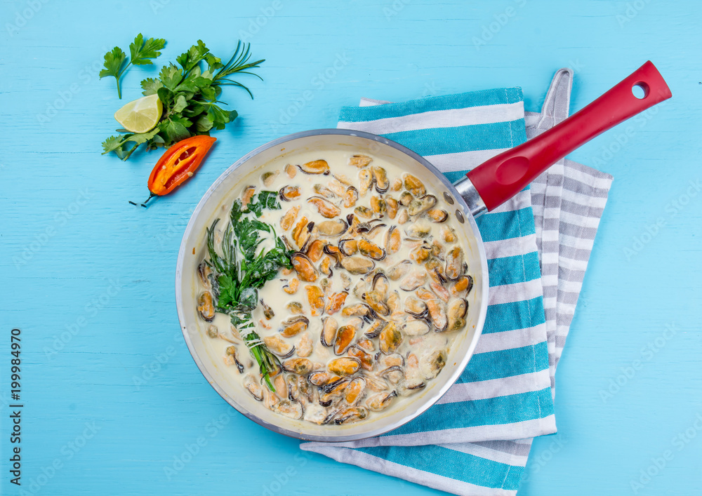 Mussels in milk cream y sauce with aromatic herbs and lemon in red cooking pan. Blue background
