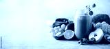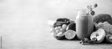 Glass jar mugs with green health smoothie, kale leaves, lime, apple, kiwi, grapes, banana, avocado, lettuce. Copy space. Raw, vegan, vegetarian, alkaline food concept. Banner