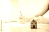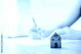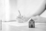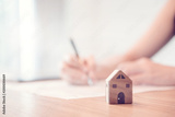 Close up wooden toy house with Woman signs a purchase contract or mortgage for a home, Real estate concept.
