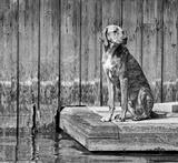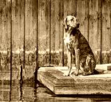 Sad dog sitting at wooden pier by lake near water. Pet animal