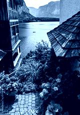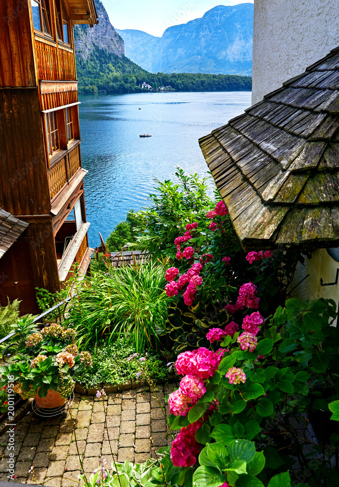 Hallstatt, Austria. Traditional austrian yard with flowerpots.