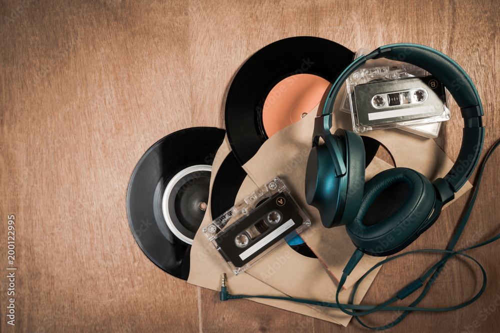 Collection of retro audio tapes and old vintage vinyl record on wooden table. Top view of audio cassettes, headset and gramophone record or old vinyl record.
