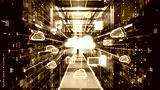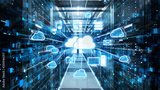 Shot of Corridor in Working Data Center Full of Rack Servers and Supercomputers with Cloud Storage Advantages Icon Visualisation.