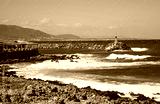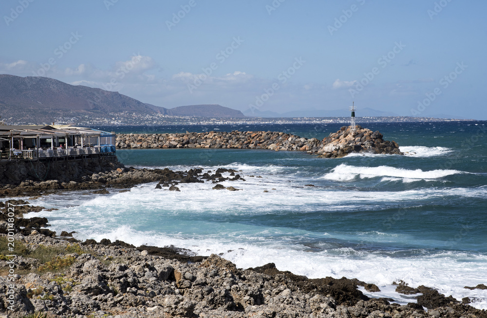 Sisi, Crete, Greece. 2017. Seafront resaurant on the harbour entrance from the Sea of Crete