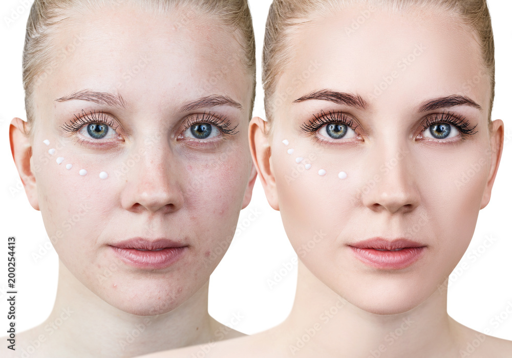 Portrait of young woman before and after make-up.