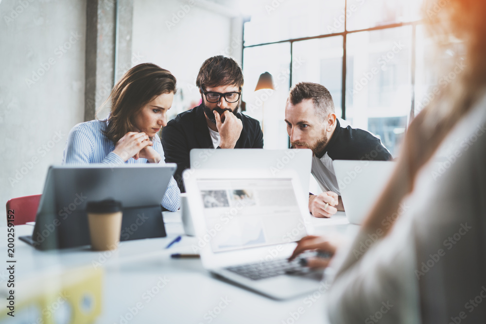 Group of Young coworkers work together modern office studio.Happy business team making conversation.Horizontal.Blurred background.
