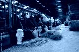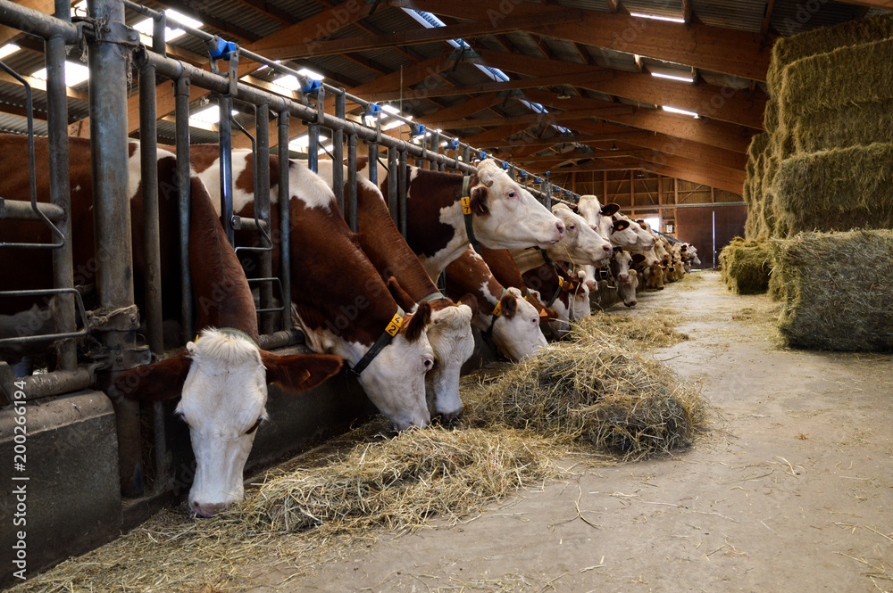 Dairy cows in stables, who eat hay. For the production of dairy products.