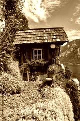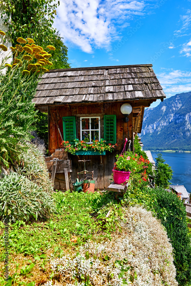 Hallstatt, Austria. Decorative wooden antique barn among green