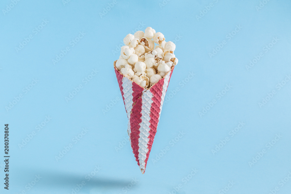 Popcorn in cone on blue background minimalistic concept.