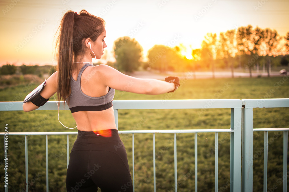 Back of sportswoman warming up outdoors during beautiful sunset.