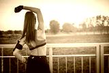 Back of sportswoman warming up outdoors during beautiful sunset.