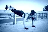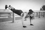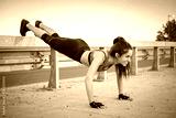 Fit young woman doing push ups over bridge's fence during evening training outdoors.