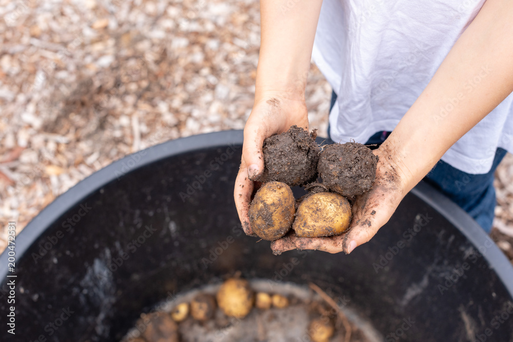 Cropped view of little girl holding freshly dug potatoes above bucket in garden (selective focus)