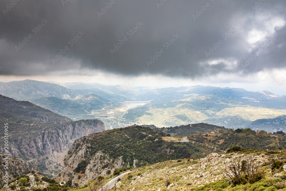 Panorama - Mountains in the eastern part of the island Crete, under heavy clouds cover. Lassithi region, Greece.