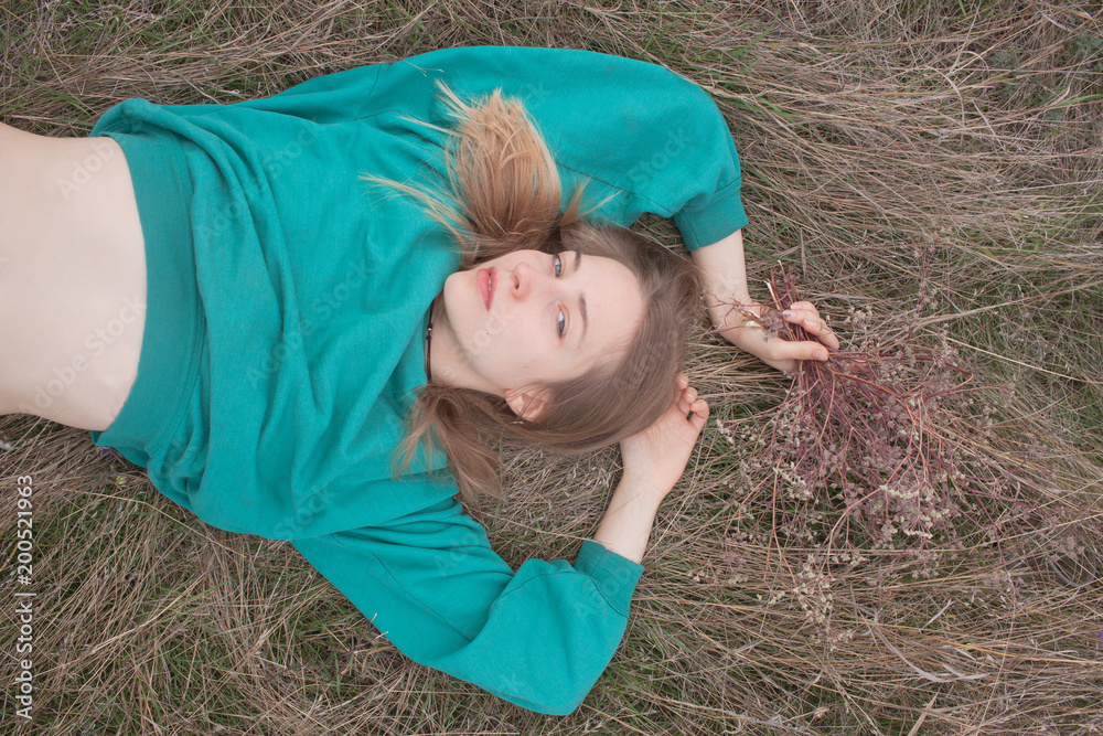 Young woman in fields, portrait of beautiful female relaxing in dry grass