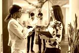 Beautiful businesswomen talking in office