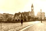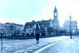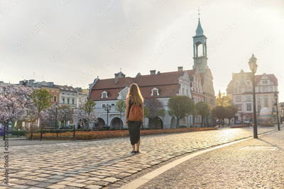 Woman in a grey dress and orange bag is walking on the street in Kluczbork, Poland