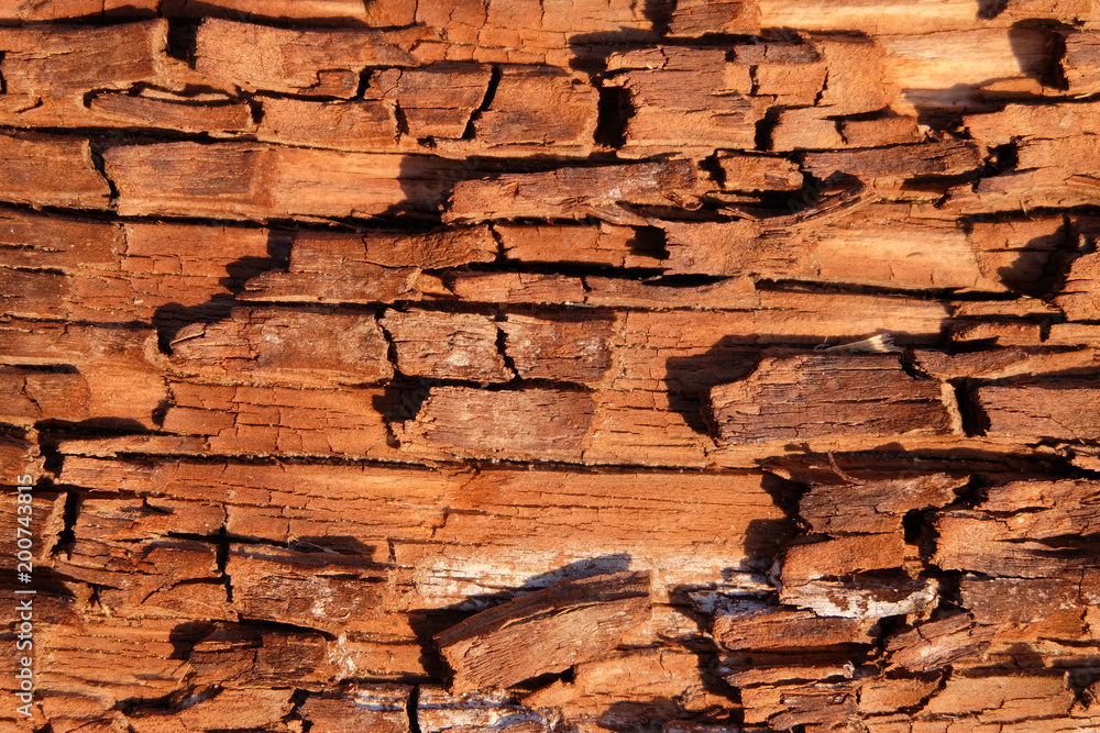 Texture of the old wooden with brown fissured rot close-up