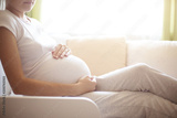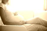 Pregnancy. Happy pregnant woman lying in bed and touching her belly at home
