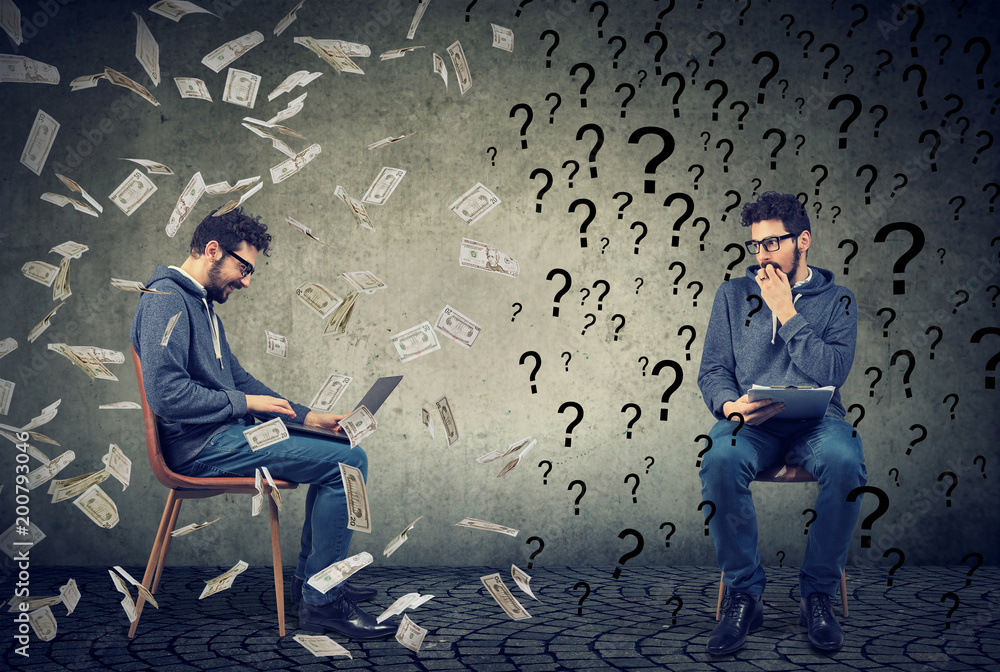 Anxious man with questions looking at successful smart guy working on laptop computer under money rain