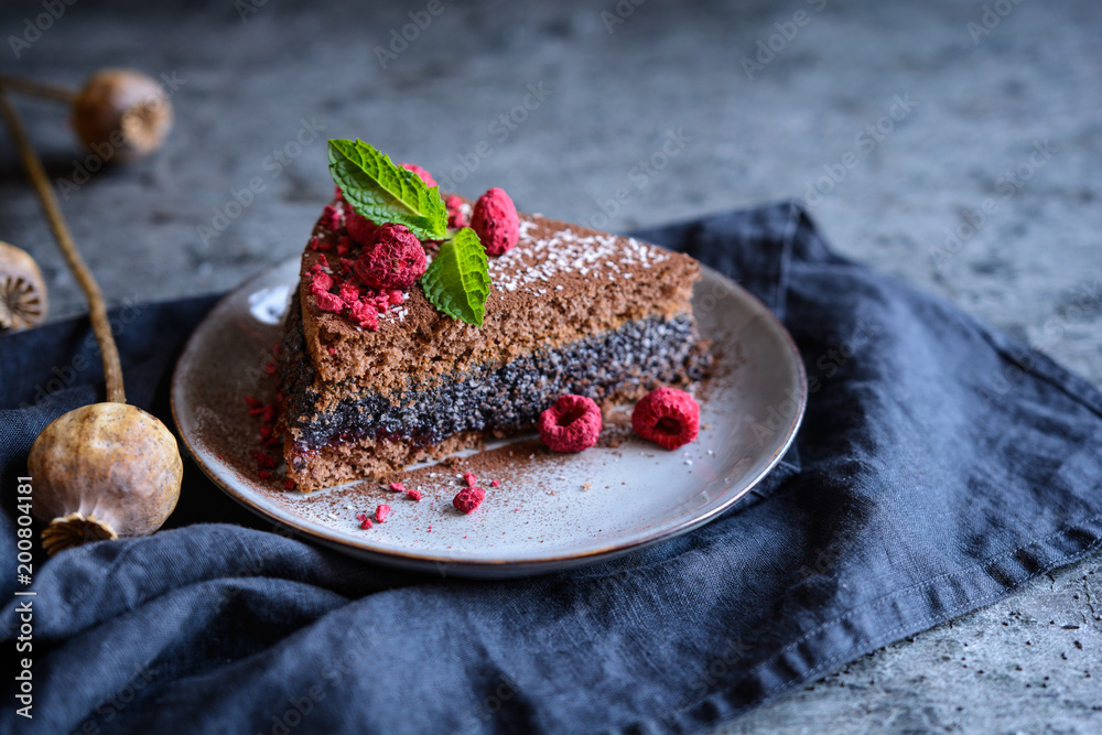 Cacao sponge cake with poppy seeds and coconut filling, decorated with freeze - dried raspberries