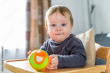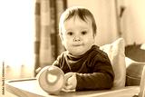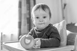 Indoor portrait of baby drinking water from orange beaker cup