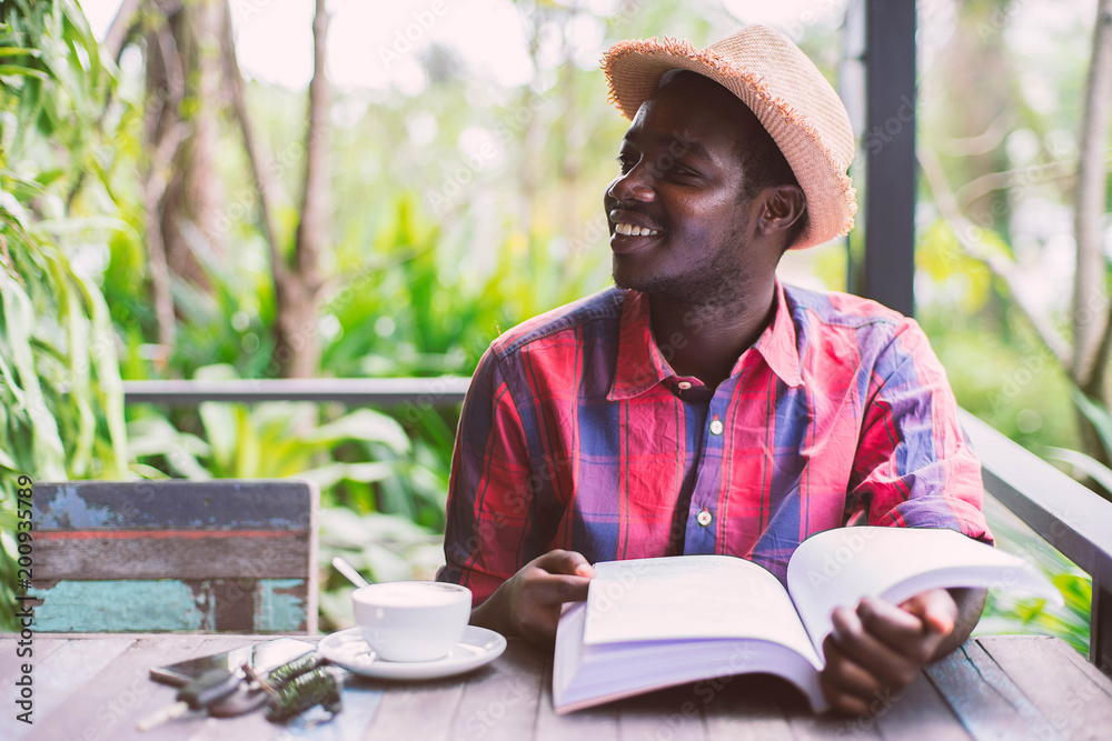 African man reading a book with coffee , key ,smartphone and green natural background.
