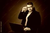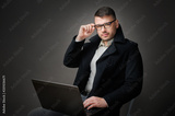 young businessman with glasses sitting holding laptop looking at camera against gray studio background.