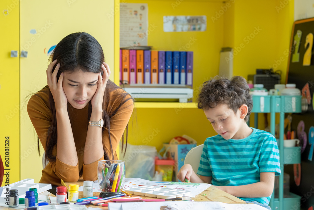 Asian woman teacher get headache with naughty boy kids in classroom at kindergarten pre school. Uncontrolled behaviour.