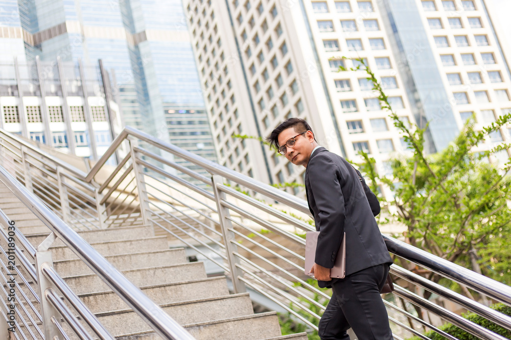 Business man with his laptop going up the stairs in a rush hour to work . Hurry time.