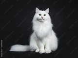 Impressive solid white Siberian cat sitting straight with tail beside body isolated on black background