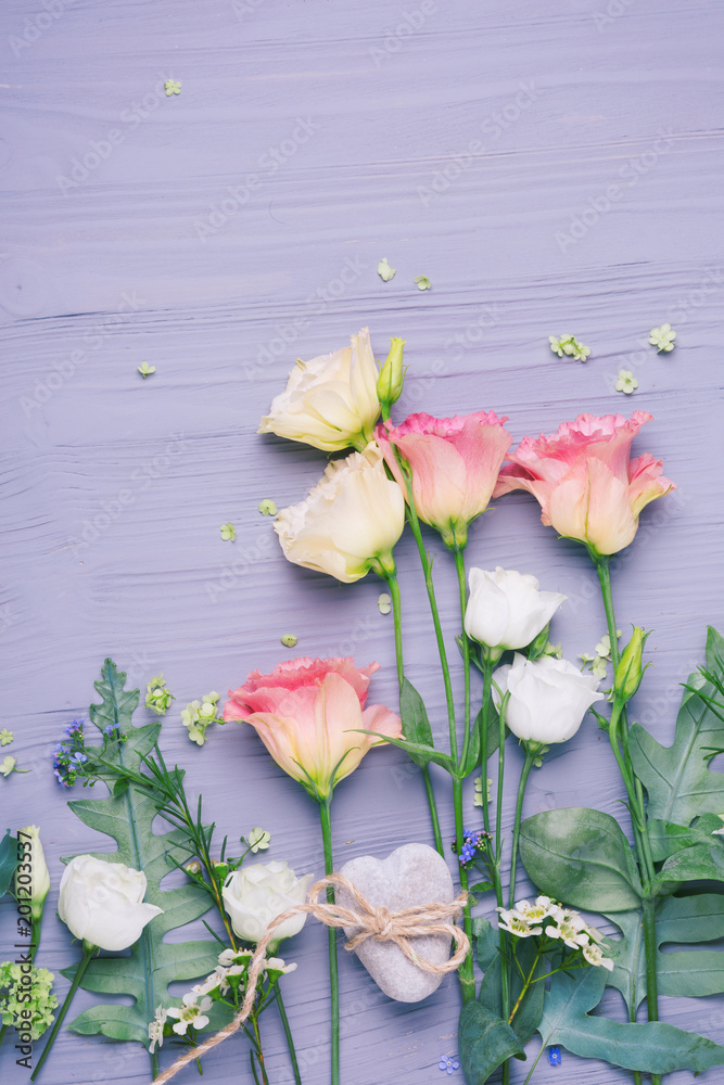Flowers and stone heart on wooden background -- Flat lay - Mothers day, Marriage,..