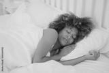 Young charming woman with curls lying in bed covered with blanket and sleeping contently having sweet dreams.