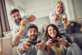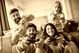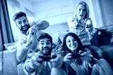 Friends playing video games at home