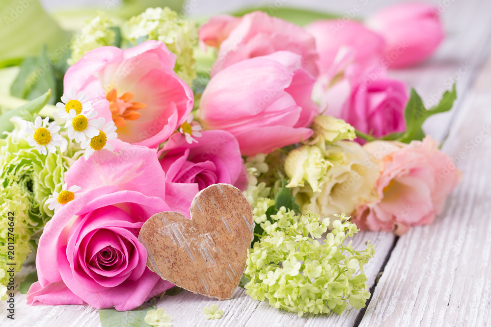 Pink flower bouquet on rustic wooden background