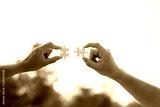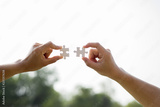 Closeup hands of woman and man connecting jigsaw puzzle