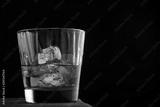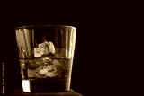 Glass of scotch whiskey and ice on a wooden table.