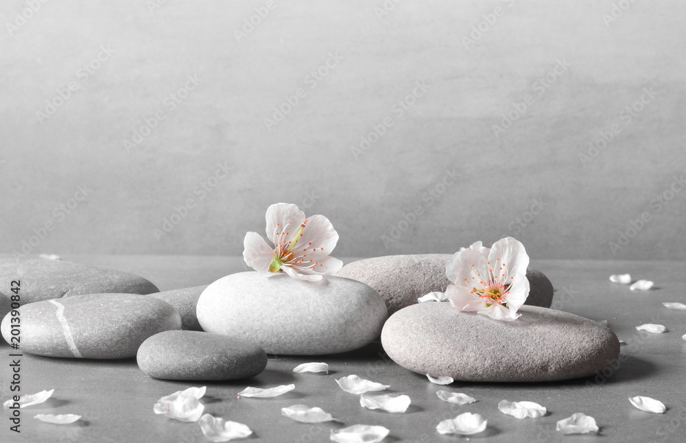 flower and stone zen spa on grey background