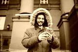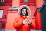handsome young male student with toothy smile and beard stands on red wall background, facade of educational institution in red winter jacket with hood with fur, Uses finger on screen of mobile phone