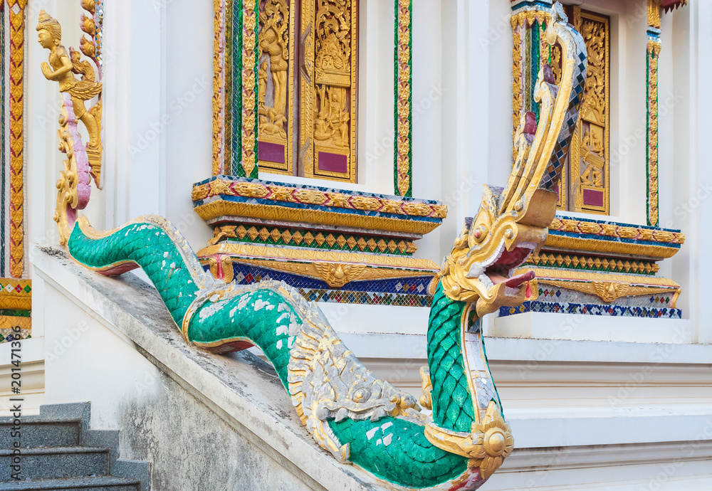 Ancient Naga Statue The staircase in the temple.Decorated with glass pieces along the body with peeling of color. It has been built for a long time.
