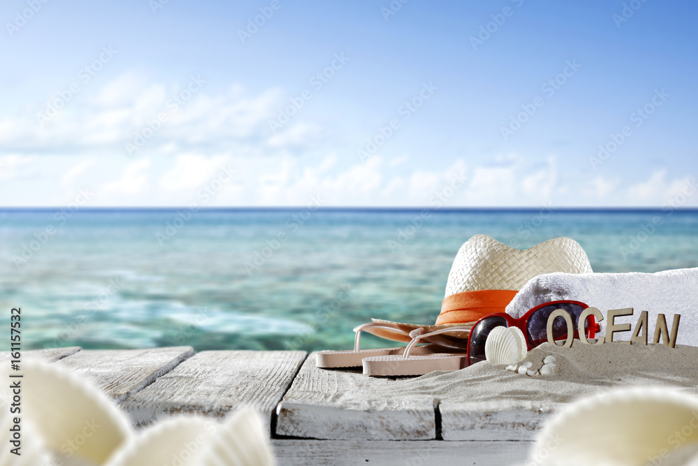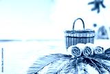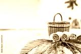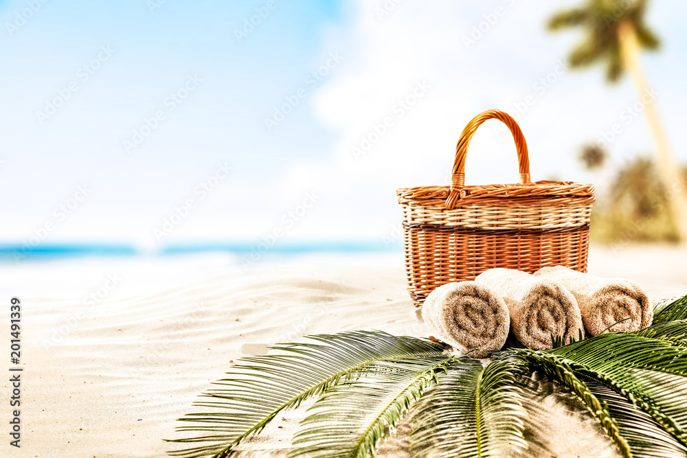 Summer picnic basket and rolled towels on the palm leaves on sandy beach. In distance blurred blue sea and sky background.