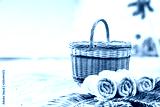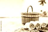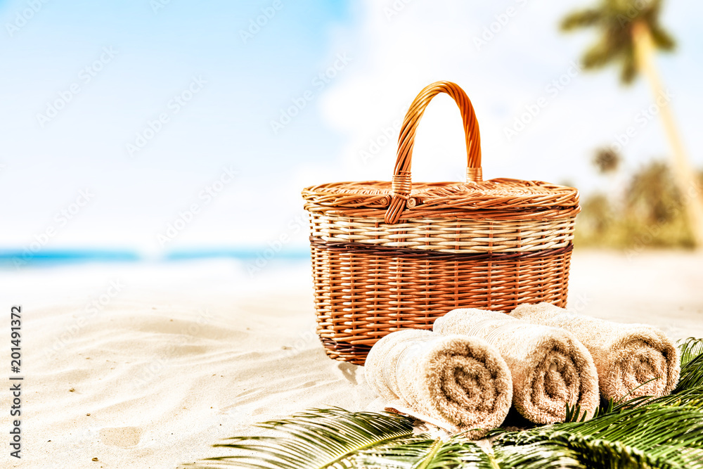 Summer picnic on beach and picnic basket and rolled towels on the palm on sand. In distance blurred blue sea and sky background.