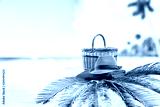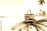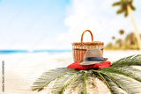 Summer picnic on beach and picnic basket and a straw sun hat on red towel on the palm on sand. In distance blurred blue sea and sky background.