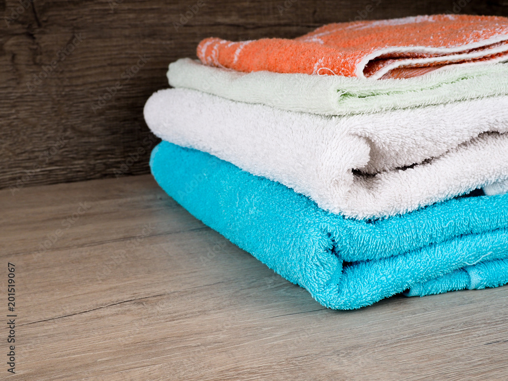 Stack of colorful bath towels. Pastel colors cotton towels. Hygiene, fabric, spa and textile concept