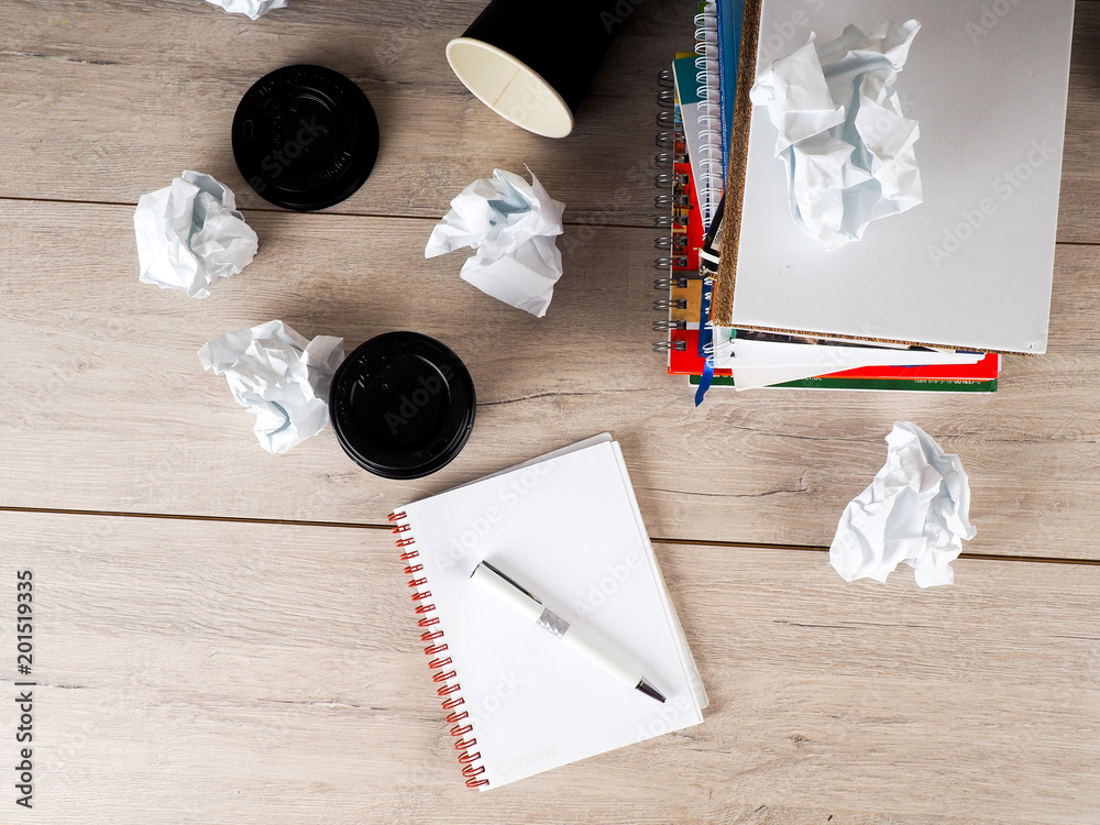 Still life with crumpled paper on books page and books stack background, the concept of the exam