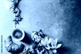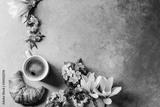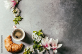 Pink mug of black espresso coffee, french croissant, cream and spring flowers magnolia, blooming cherry branches over grey texture background. Top view, space. Spring greeting card, wallpapers