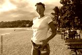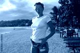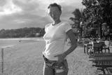 Beautiful young woman in a white t-shirt on the beach. Mock-up.