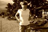 Beautiful young woman in a white t-shirt on the beach. Mock-up.