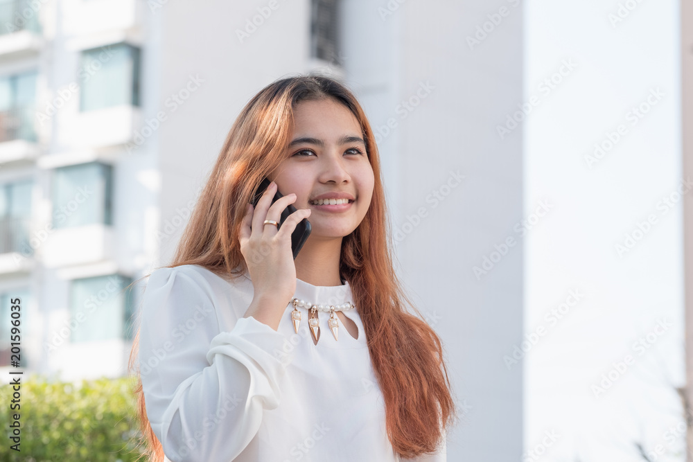 Businesswoman in casual cloth talking on mobile phone outside office building in sunny day.Business communication
